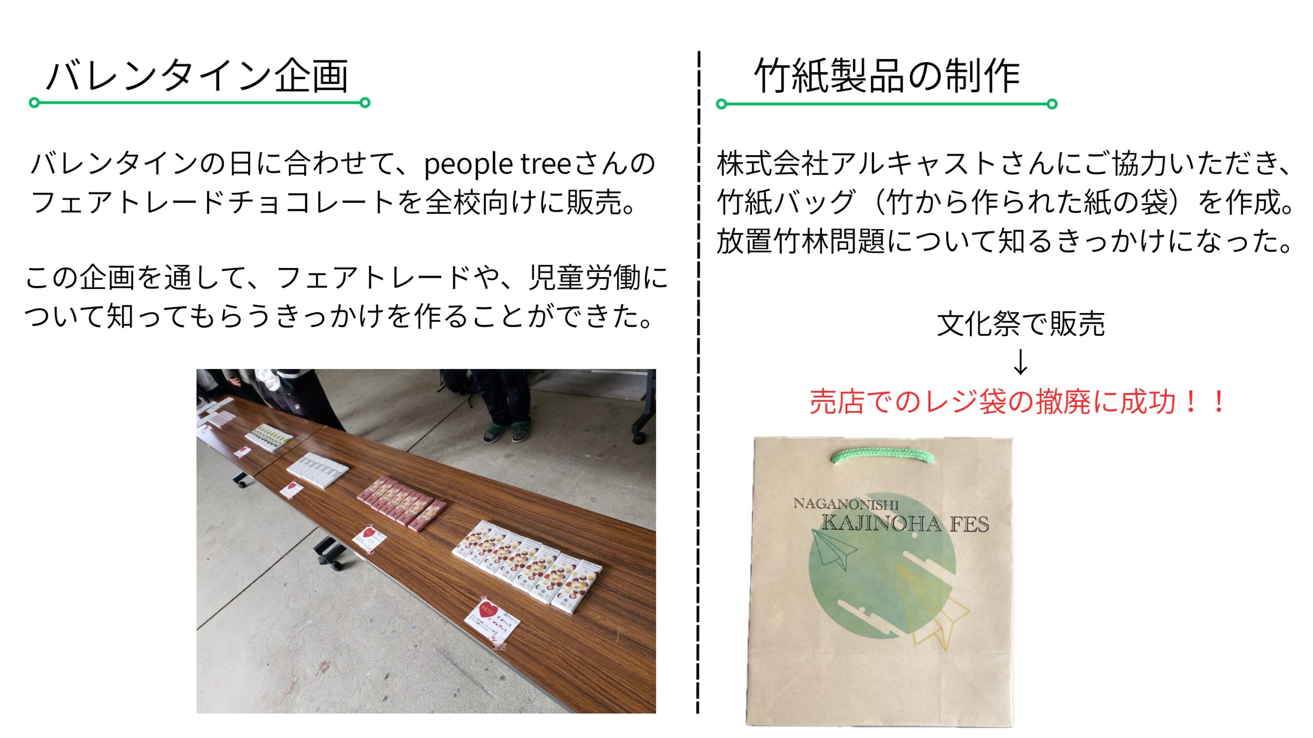 私たちはSDGsに関連する活動を通して、世界の問題について知ってもらい、自分たちにできることを考えてもらうことを目的に活動しています。昨年度から引き続き行っている竹紙バッグの製作は全校にもデザインを考えてもらい、放置竹林問題について多くの人に知ってもらうことができました。1月に行った書き損じはがきの回収ではアジア諸国の教育を支援するため、約8000円の募金をすることができました。