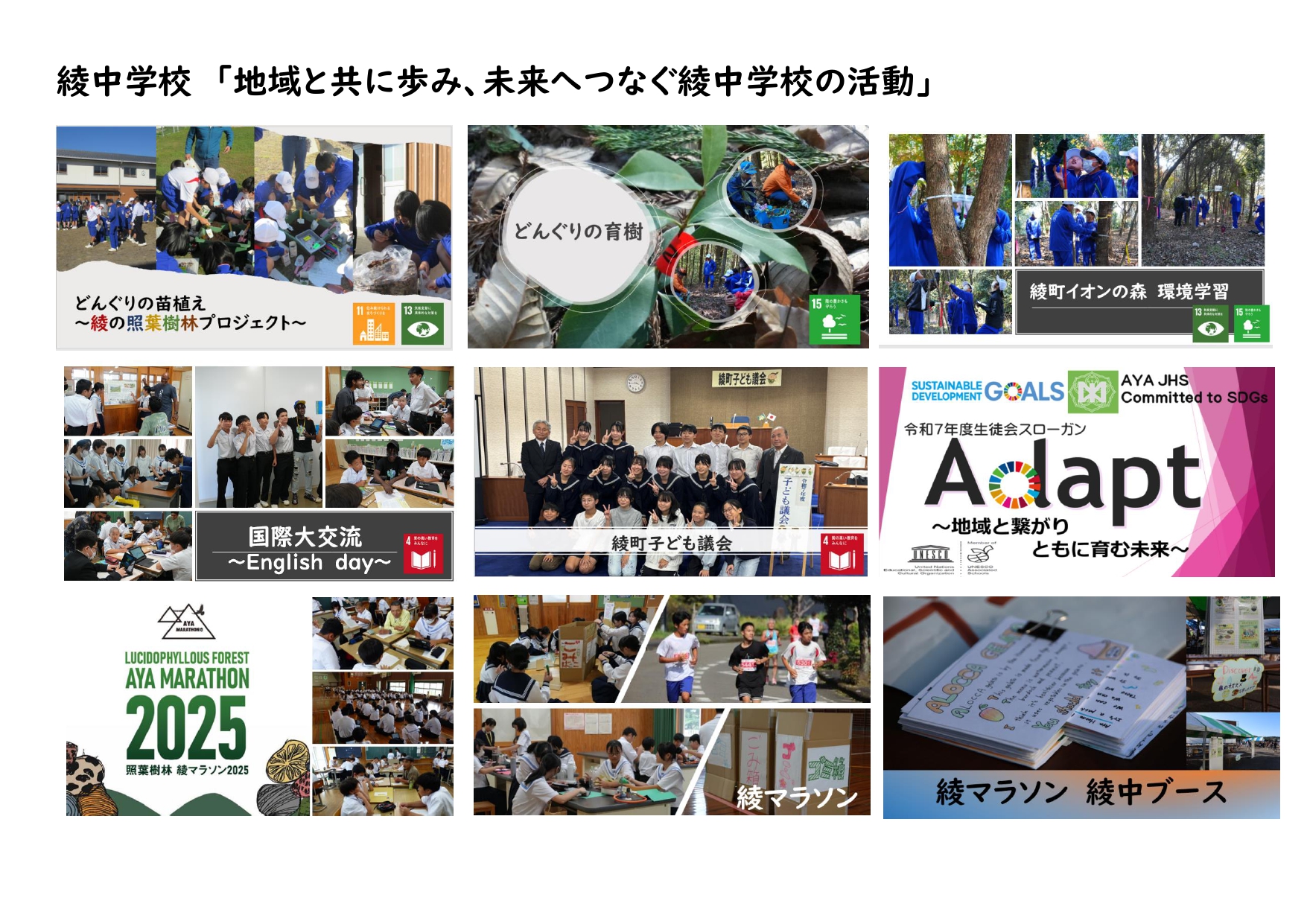 綾中学校は、綾町の豊かな自然に囲まれた校舎を中心に、生徒一人ひとりが主体的に学び、地域とつながる教育活動を大切にしている学校です。生徒会は、今年度のスローガン「Adapt」のもと、各委員会が協力してより良い学校づくりを進めています。昨年度から継続して行っているペットボトルキャップ回収やコンタクトレンズケース回収では、環境保全への意識を高めることができました。さらに、地域と連携した綾プロやイオンの森調査活動を行い、学びを広げています。また、照葉樹林綾マラソン2025では、生徒が主体となって企画・運営に挑戦し、学校全体の団結を深めました。