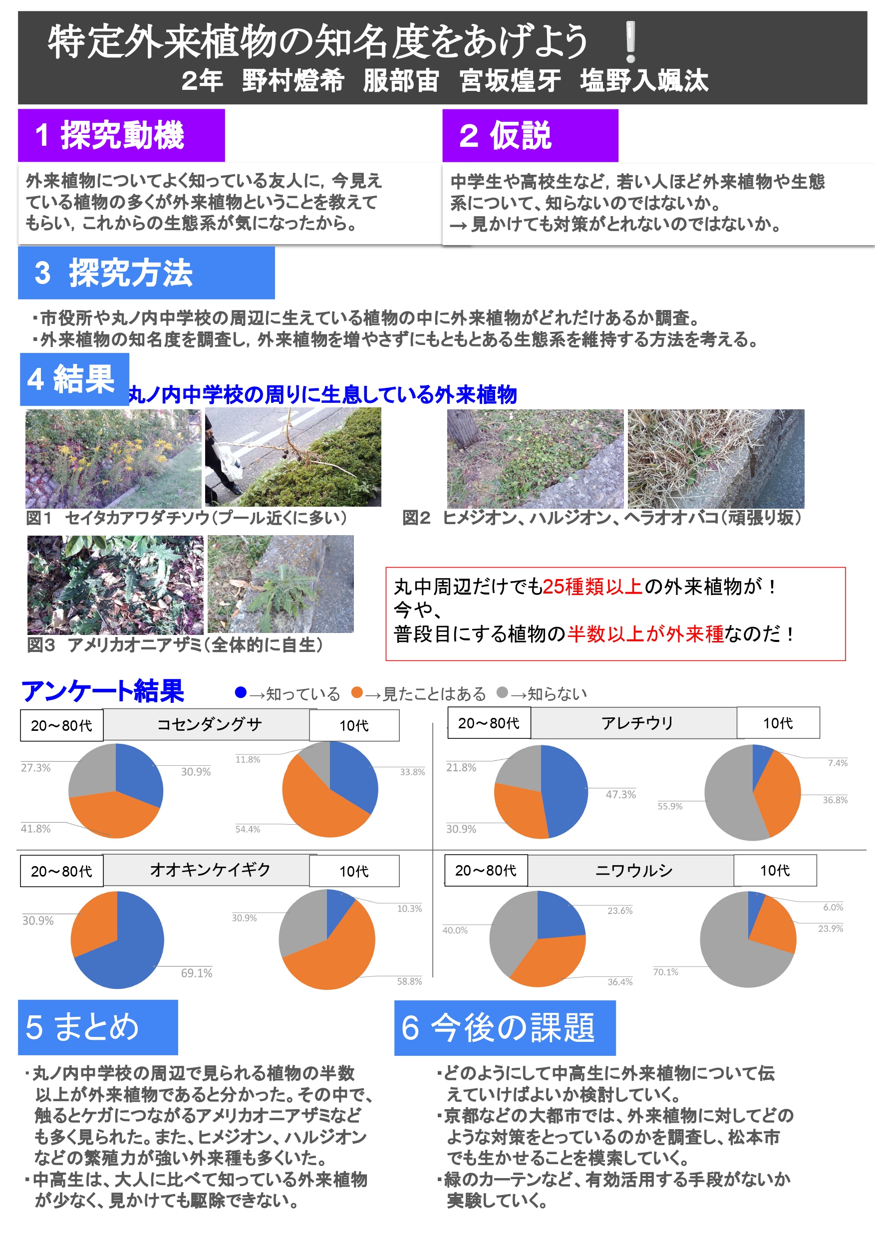 「普段目にする植物の半分以上が外来植物であることに気付いて生活している人は少ないのではないか」という疑問から、松本市が指定している特定外来植物の写真を見て、どのくらいの人が見分けがつくのかを調査しました。その結果から若年層の方がより見分けがつかないという現状が浮かび上がってきました。そこで私たちは、これからを生きる世代に日本古来の豊かな植物の生態系を残していくには、何ができるか考えていきたいと思い探究活動を行っています。